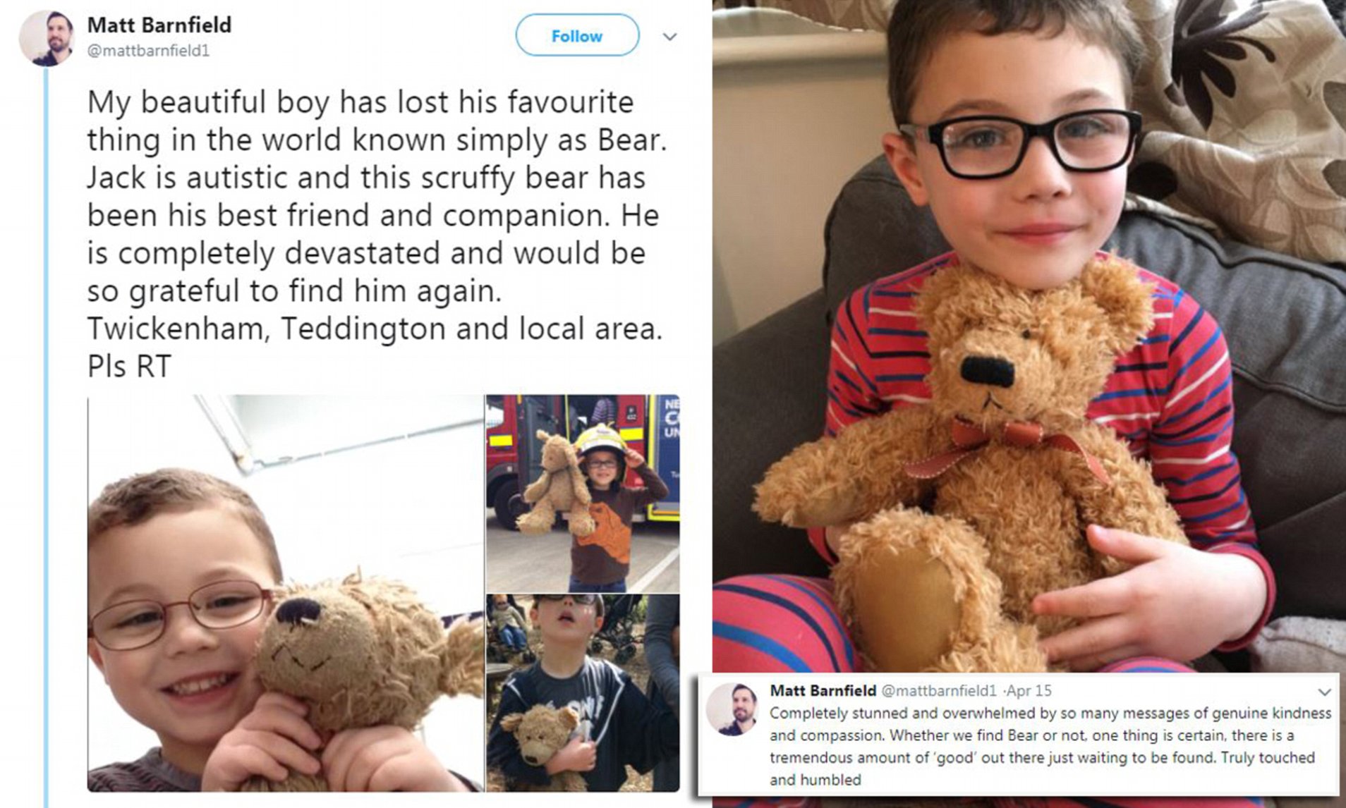 Ο επτάχρονος Jack Barnfield, ένα παιδί στο φάσμα του αυτισμού από το Λονδίνο, δεν μπορούσε να πιστέψει ότι έχασε τον αγαπημένο του αρκούδο, που τον είχε για 4 χρόνια, δηλαδή, σχεδόν για όλη του τη ζωή! Ο πόνος της απώλειας ήταν αβάσταχτος και ο Jack δεν μπορούσε πλέον να κάνει τίποτα χωρίς τον αγαπημένο του αρκούδο. Ο πατέρας του, Matt Barnfield δεν άντεχε να βλέπει τον γιο του τόσο στεναχωρημένο. Με μια ανάρτηση στο Twitter ανακοίνωσε το γεγονός και κάλεσε όποιον έχει δει τον αρκούδο να τους ειδοποιήσει.